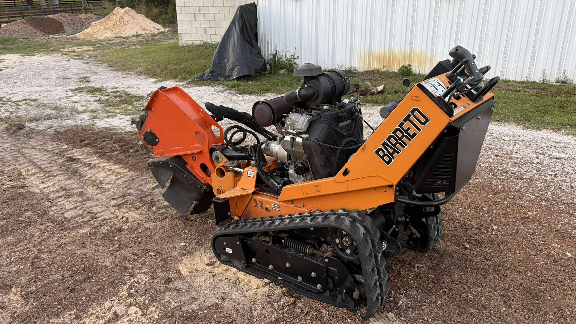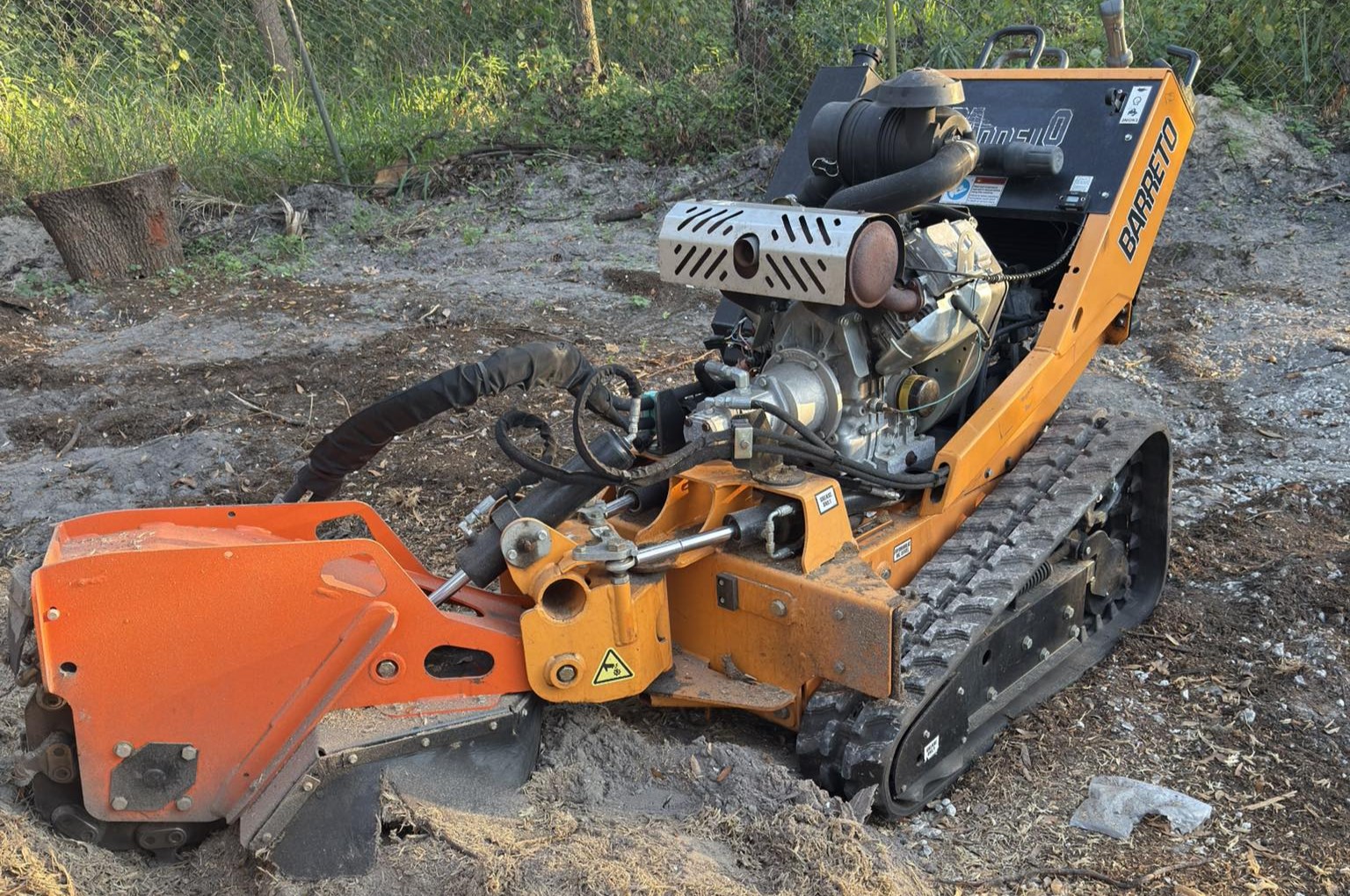 Book Yours TODAY!Haul Yeah stump grinders are built to deliver powerful stump removal while remaining compact enough for residential yards and tight job sites across Tampa and Central Florida. Our fleet features Barreto track-driven stump grinders powered by a 31 horsepower Vanguard V-Twin engine, giving operators the strength needed to grind through dense wood and root systems quickly and efficiently. These machines use a 19-inch cutting wheel equipped with 16 carbide teeth, designed to aggressively chip away stumps while maintaining smooth and controlled operation.